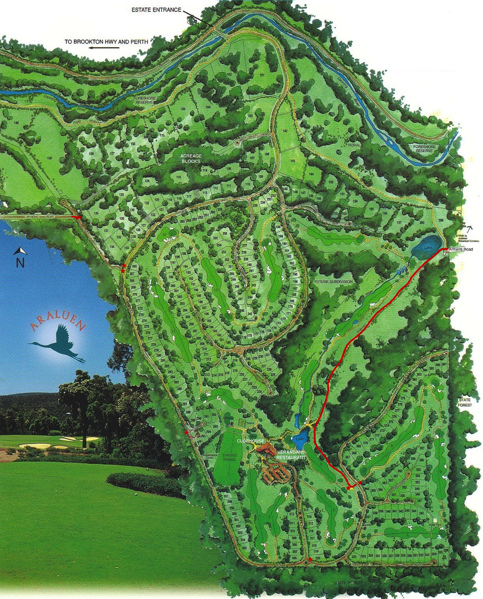The Alternative Exit if the fire approaches the estate from the West is accessed by turning onto the cart track on the left hand side of Heritage Drive between the 8th and 9th hole. Follow the cart track (it would be manageable by a normal car) for 20 meters until you see the dirt track on the right and proceed down the right hand side of the 9th fairway, past the two lakes and continue down the 17th and 18th fairways, around the dam at the 16th hole and then via an emergency gate onto Armenti Road (was Bristol Road). Directions to both Emergency Exits are indicated by red signs.